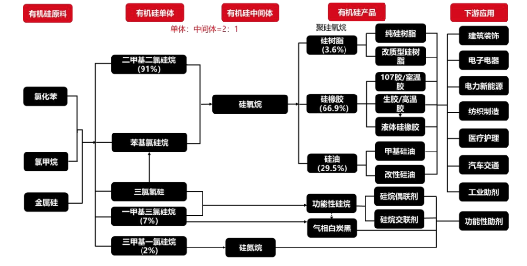 有機(jī)硅行業(yè)上游主要是金屬硅、氯化氫、氯甲烷等基礎(chǔ)化工原料,有機(jī)硅中間體經(jīng)聚合得到硅橡膠、硅油、硅烷偶聯(lián)劑和硅樹(shù)脂等終端產(chǎn)品。其中硅橡膠和硅油占比最大,分別達(dá)到66%和22%。二甲基二氯硅烷是有機(jī)硅工業(yè)中最廣泛生產(chǎn)的單體,其上游原料是金屬硅和氯甲烷,下游合成有機(jī)硅DMC、有機(jī)硅D4等中間體,然后再用于生產(chǎn)硅橡膠、硅樹(shù)脂、硅油等終端產(chǎn)品。